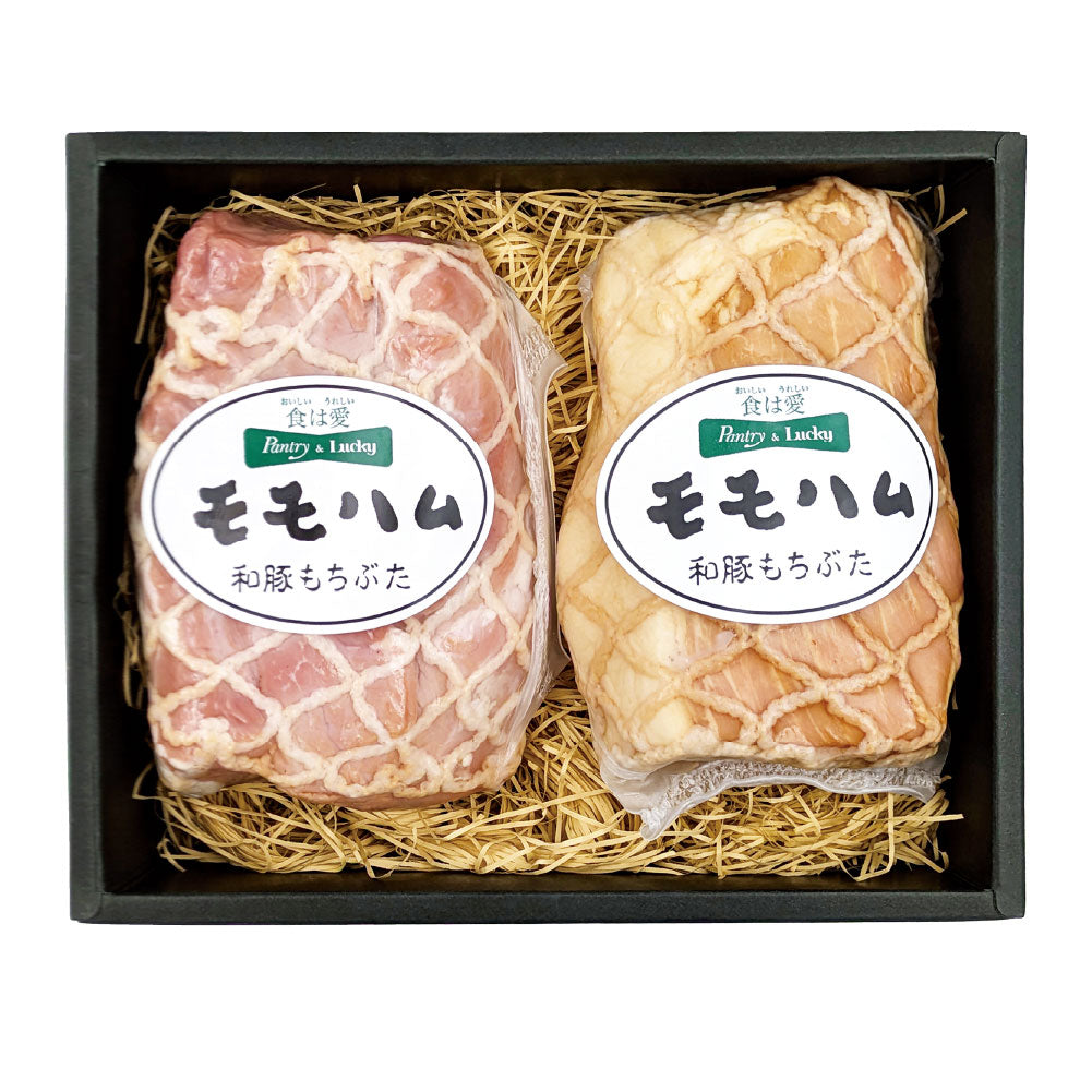 和豚もちぶたの旨味たっぷりのモモ肉を特製の漬込み液に浸して仕上げた、ノンスモークタイプと桜チップのスモークを効かせた2種類のモモハムセットです。