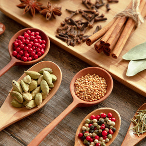 - コリアンダー(モロッコ・インド産)、クミン(インド・イラン・トルコ産)、ターメリック、パプリカ、ペッパー、フェンネル、レッドペッパー、クリーブ、カルダモン、シナモン、ナツメグ、ブラックペパー、ジンジャー、チンピ