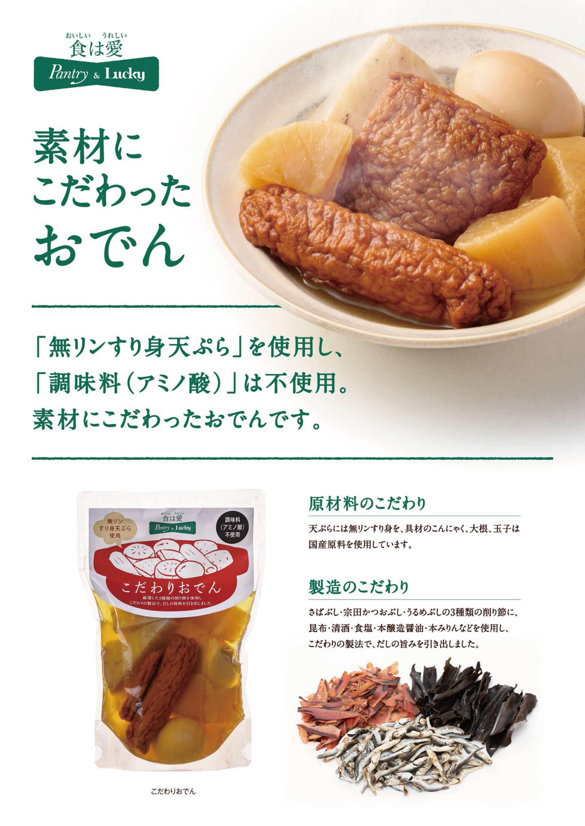 - 出汁つゆ(本醸造醬油、砂糖、本みりん、さばぶし、宗田かつおぶし、清酒、食塩、昆布、うるめぶし)(国内製造)、大根、ゆで卵、魚肉練り製品、(ごぼう天、角天)、こんにゃく/水酸化Ca(こんにゃく用凝固剤)、 (一部に小麦・卵・大豆・さばを含む)
